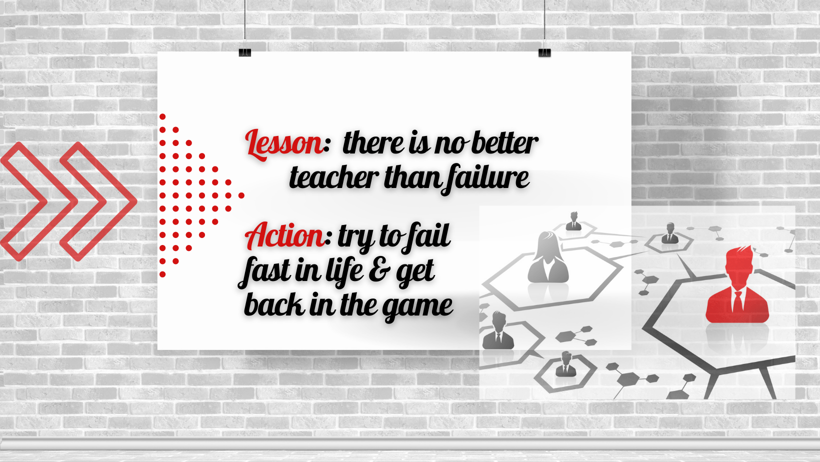 While your connections are critical to your own success, so is failure. All successful people whom I’ve come across in my life have experienced failure of some type. In his book The Obstacle is the Way, Ryan Holiday discusses this very thing. Often, we look back on the challenges we have overcome in life that were critical to our personal success. Holiday’s thesis is that we should embrace our struggles and failures and even be grateful for those struggles because they make us who we are. Examine your own journey and if you are not overcoming struggles and failure, ask yourself how you can succeed.